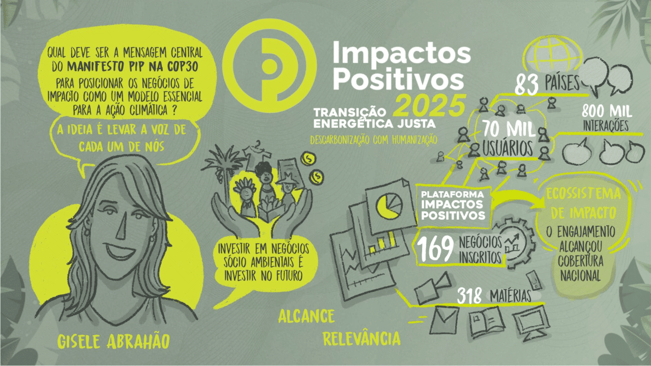 Painéis, PIP Talks, lançamento da Carta Manifesto Impactos Positivos para a COP30 e a entrega do Prêmio Impactos Positivos 2025 mobilizaram o ecossistema de impacto brasileiro em torno de uma agenda comum: unir inovação, justiça social e sustentabilidade para construir um futuro positivo, justo e coletivo.